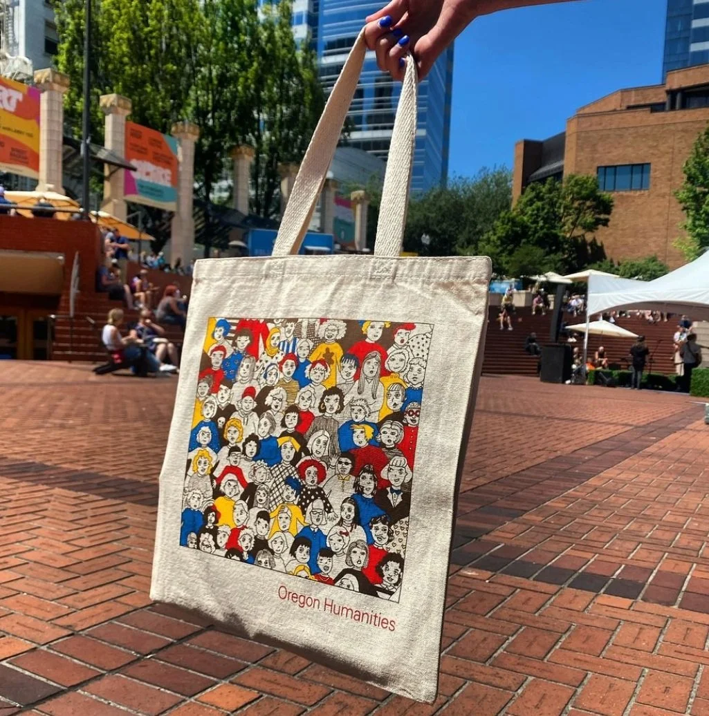 Original design adapted for a screenprinted canvas tote bag. Created for Oregon Humanities Spring/Summer 2024 Giving Campaign.